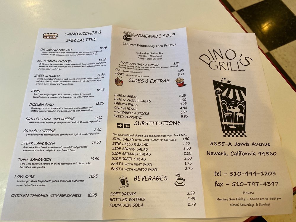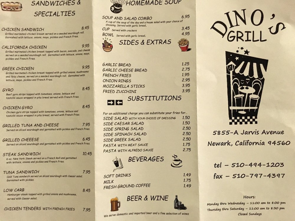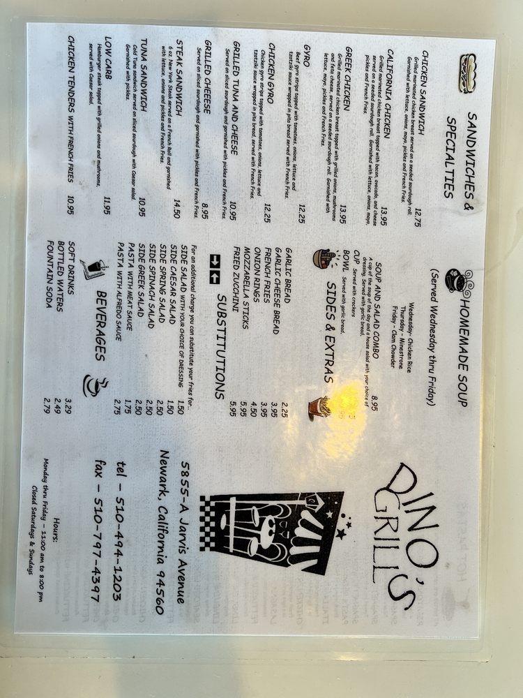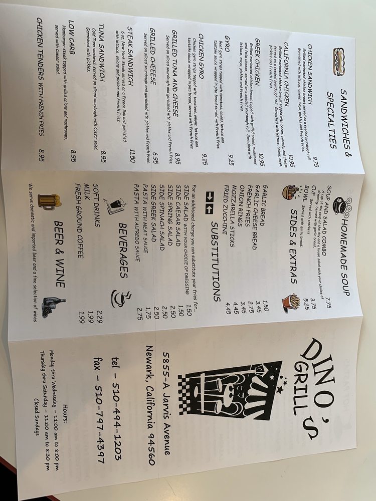 Welcome to Dino's Grill, a delightful fusion of Greek and Italian flavors nestled in Newark, CA. Located at 5855 Jarvis Ave, this eatery offers a rich menu that is sure to satisfy diverse palates. Highlights include their homemade Caesar Salad, which can be customized with grilled chicken or a tuna scoop, and the Greek Salad featuring fresh vegetables and flavorful Italian dressing.